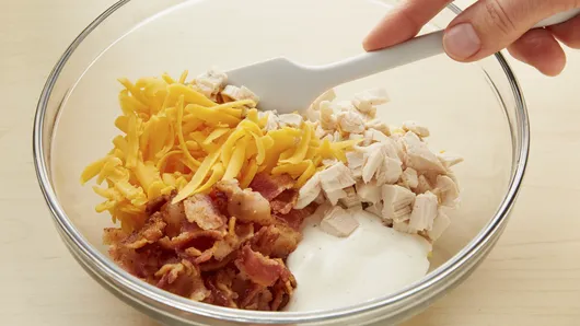 Step2In medium bowl, mix chicken, bacon, cheese and dressing until well mixed.