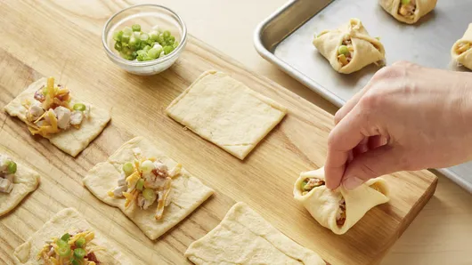 Step4Spoon about 1 tablespoon chicken mixture on center of each dough square. Sprinkle with green onions. Bring 4 corners together to overlap slightly in center at top of each bundle. Twist and pinch to seal, leaving small gaps between seams. Place 2 inches apart on ungreased large cookie sheet.