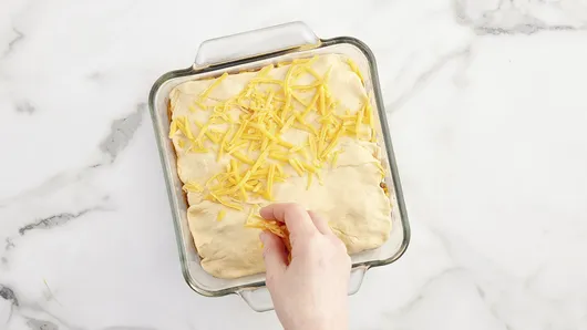 Place dough in baking dish on top of cheese layer, and tuck in edges. Top with remaining 1/4 cup cheese. Bake 16 to 20 minutes or until deep golden brown and crescent is baked through.