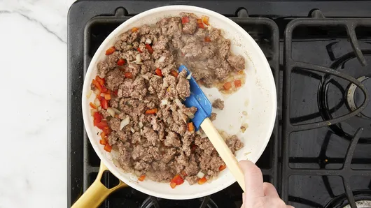 Heat oven to 375°F. Spray 8-inch square (2-quart) glass baking dish with cooking spray. In 10-inch nonstick skillet, cook beef, onion and bell pepper over medium-high heat 6 to 8 minutes, stirring occasionally, until beef is no longer pink; drain.
