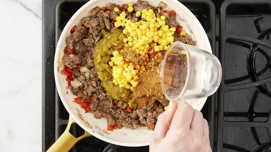 Stir corn, green chiles, taco seasoning mix and water into beef mixture in skillet. Heat to simmering over medium heat. Simmer 3 to 4 minutes, stirring occasionally, until slightly thickened. Spoon into baking dish. Top beef mixture with 1/2 cup of the cheese.