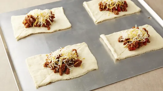 Step3Spoon about 1/3 cup beef mixture on center of each rectangle. Sprinkle with 2 tablespoons cheese.