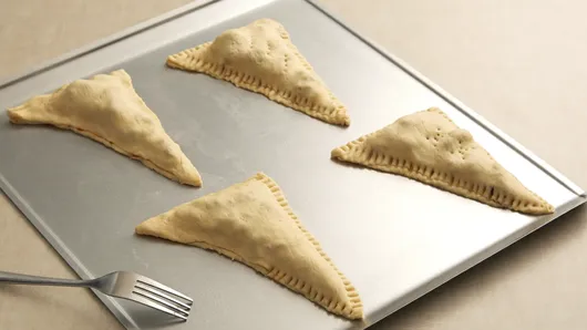Step3Gently stretch remaining 4 triangles; turn over onto filled triangles, firmly pressing edges with fork to seal. With fork, prick top of each to allow steam to escape.