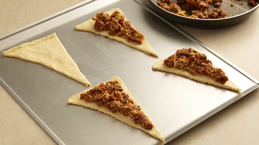 Step2Unroll dough; separate into 8 triangles. Place 4 triangles on ungreased cookie sheet, and gently press so wide end of triangle is about 4 inches across. Place about 1/3 cup filling on top of each triangle, spreading within 1/2 inch of edge.