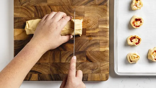Roll the dough tightly (tight is key!), pinch to seal, and slice into even rounds.