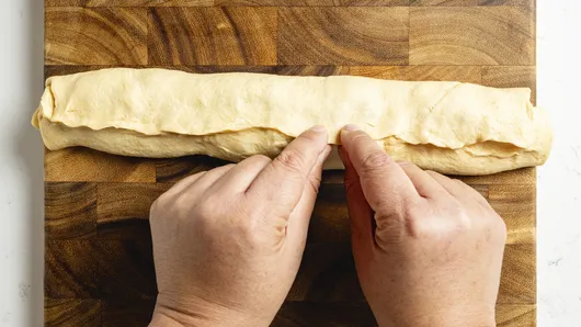 Starting at long edge opposite the border, roll dough tightly into a log, and pinch seam to seal.
