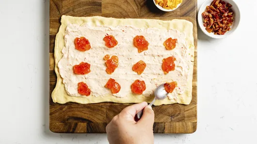 Unroll the crescent dough into a rectangle, then spread pimiento cheese evenly over the dough, leaving a 1/2-inch border on one long edge (otherwise it will be tricky to get the dough to seal together). Dot red pepper jelly all over the pimiento cheese layer, then top with shredded sharp cheddar cheese and bacon crumbles.