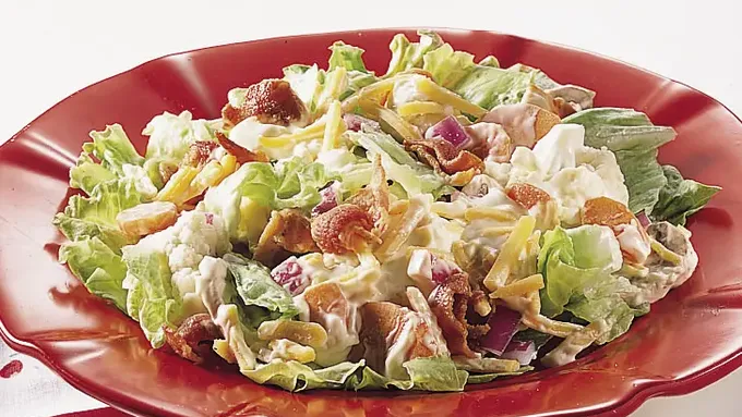 Enjoy this sweet and tangy vegetable salad that’s topped with bacon - a flavorful side dish.