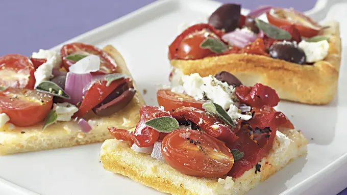 Refrigerated pizza crust makes quick work of home-baked appetizers topped with delicious Mediterranean ingredients.