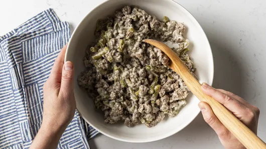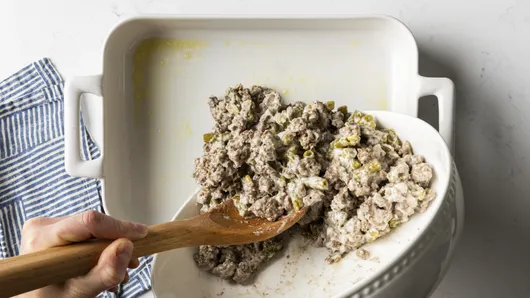 Use the same skillet (or a medium bowl) to mix the beef with the salt and pepper and drained green beans until they are well mixed. Pour the filling into the baking dish. We prefer to use a glass or ceramic baking dish for casseroles as metal pans can cause the edges of the food to get too crispy and dried out.