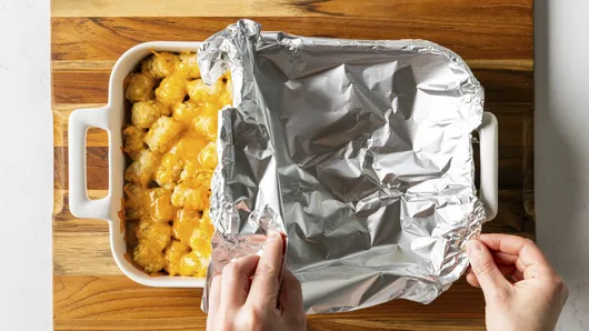 Cover the dish with aluminum foil for most of the baking, so that the casserole can get hot and bubbly all the way through. Remove the foil for the final 15 minutes of baking to allow the tater tots to crisp up.