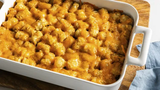 var configuration = {"title":"Tater Tot Casserole","introduction":"\u003cp\u003eIs it a hotdish or a casserole? Midwesterners call it hotdish, while other parts of the country call it a casserole. Whichever term you use this hearty supper dish has its roots in the pages of a Southern Minnesota church cookbook. The first casserole recipe started as a farm wife’s solution for an inexpensive meal. It contained ground beef, tomato soup, macaroni, and peas.\u003c/p\u003e\u003cp\u003eOur recipe takes advantage of ready-to-use ingredients so prep and clean up are a breeze. A perfectly seasoned ground beef mixture, under a comfy layer of cheese-topped tater tots, that everyone in the family will love. This hot and hearty dinner is a great choice when the weather turns cold. Because of its quick prep and delicious flavor it’s a perfect meal for even a busy weeknight. When you need to fill tummies fast.\u003c/p\u003e","servingSize":"1/8 of Recipe","image":{"small":{"media":"(min-width: 0px)","src":"https://mojo.generalmills.com/api/public/content/gLdYN2mkR4GVhmeq7GQ6Cg_webp_base.webp?v=65a0c93e\u0026t=e724eca7b3c24a8aaa6e089ed9e611fd"},"medium":{"media":"(min-width: 500px)","src":"https://mojo.generalmills.com/api/public/content/gLdYN2mkR4GVhmeq7GQ6Cg_webp_base.webp?v=65a0c93e\u0026t=191ddcab8d1c415fa10fa00a14351227"},"large":{"media":"(min-width: 767px)","src":"https://mojo.generalmills.com/api/public/content/gLdYN2mkR4GVhmeq7GQ6Cg_webp_base.webp?v=65a0c93e\u0026t=191ddcab8d1c415fa10fa00a14351227"},"alt":"Tater Tot Casserole"},"contributor":{"label":"By","name":"Edited by Joanna","profileUrl":"/about-us/joanna","displayDate":{"label":"Updated","date":"Jul 23, 2025"}},"ingredientGroups":[{"ingredients":[{"quantity":"1 1/2","description":"lbs ground beef"},{"quantity":"1","description":"bag Ore-Ida™ Tater Tots™ frozen potatoes "},{"quantity":"1","description":"can condensed cream of mushroom soup"},{"quantity":"1","description":"can green beans, drained"},{"quantity":"1 1/2","description":"cups shredded cheddar cheese"},{"quantity":"1/2","description":"teaspoon salt"},{"quantity":"1/2","description":"teaspoon pepper"}]}],"steps":[{"description":"\u003cp\u003ePreheat oven to 350°F. Spray 13x9-inch (3-quart) ceramic or glass baking dish with cooking spray.\u003c/p\u003e","stepShotImageUrl":"//mojo.generalmills.com/api/public/content/Ja9j6j4hTb2CuL8D4rB0aA_webp_base.webp?v=11fea4d6\u0026t=51a43a57af4046789e5a7f20567b1195"},{"description":"\u003cp\u003eBrown ground beef in medium skillet over medium-high heat until thoroughly cooked, stirring frequently, 5 to 7 minutes. Drain.\u003c/p\u003e","stepShotImageUrl":"//mojo.generalmills.com/api/public/content/sNu53PUFSeuXrmW7SScxFA_webp_base.webp?v=4244c540\u0026t=51a43a57af4046789e5a7f20567b1195"},{"description":"\u003cp\u003eMix cooked beef, salt, pepper, soup, and green beans.\u003c/p\u003e","stepShotImageUrl":"//mojo.generalmills.com/api/public/content/YB8bU4dhRcmipW9MueiUeA_webp_base.webp?v=53d4c6ca\u0026t=51a43a57af4046789e5a7f20567b1195"},{"description":"\u003cp\u003ePour in prepared baking dish.\u003c/p\u003e","stepShotImageUrl":"//mojo.generalmills.com/api/public/content/ggIch1LYR02SBic40OX6Qw_webp_base.webp?v=316f350b\u0026t=51a43a57af4046789e5a7f20567b1195"},{"description":"\u003cp\u003ePlace Tater Tots™ on top of beef mixture. Then, top with cheddar cheese.\u003c/p\u003e","stepShotImageUrl":"//mojo.generalmills.com/api/public/content/4t8WG7FmTYKfgGZVNcurcw_webp_base.webp?v=1876d169\u0026t=51a43a57af4046789e5a7f20567b1195"},{"description":"\u003cp\u003eCover with foil and bake 45 minutes.\u003c/p\u003e","stepShotImageUrl":"//mojo.generalmills.com/api/public/content/Zic4HHDuRJGr7YGUav3zSA_webp_base.webp?v=432ba0ad\u0026t=51a43a57af4046789e5a7f20567b1195"},{"description":"\u003cp\u003eRemove foil and bake an additional 15 minutes.\u003c/p\u003e","stepShotImageUrl":"//mojo.generalmills.com/api/public/content/e2arejyRScWnGLPVj8VGTw_webp_base.webp?v=b2428858\u0026t=51a43a57af4046789e5a7f20567b1195"},{"description":"\u003cp\u003eServe immediately.\u003c/p\u003e","stepShotImageUrl":"//mojo.generalmills.com/api/public/content/hfTNYS2PTt29GEdiNww4Yw_webp_base.webp?v=711083f9\u0026t=51a43a57af4046789e5a7f20567b1195"}],"tips":[{"title":"","description":"This classic tater tot casserole is quick to prep, easy to clean up, and packed with cozy flavor—perfect for busy weekdays and chilly nights.","category":"Rich Snippet","tipShots":[]},{"title":"","description":"Adding 1 to 2 teaspoons of Worcestershire sauce to the ground beef while cooking adds a hint of extra flavor. ","category":"Variation","tipShots":[]},{"title":"","description":"Swap in sweet potato tater tots for a surprising twist. ","category":"Substitution","tipShots":[]},{"title":"","description":"Use shredded pepper Jack cheese in place of cheddar cheese to add some extra zip.","category":"Variation","tipShots":[]},{"title":"TIP FROM THE Doughboy","description":"\u003cp\u003eLayer your tots in neat rows for extra crunch in every bite!\u003c/p\u003e","category":"Pillsbury Highlight","tipShots":[]}],"kitchenTips":[{"title":"","description":"Adding 1 to 2 teaspoons of Worcestershire sauce to the ground beef while cooking adds a hint of extra flavor. ","category":"Variation","tipShots":[]},{"title":"","description":"Swap in sweet potato tater tots for a surprising twist. ","category":"Substitution","tipShots":[]},{"title":"","description":"Use shredded pepper Jack cheese in place of cheddar cheese to add some extra zip.","category":"Variation","tipShots":[]}],"additionalContent":[{"title":"Tater Tot Casserole Ingredients","description":"\u003cp\u003eOnly 7 ingredients are needed to throw this easy tater tot casserole together. Below is why each one is an important player in this well-loved classic casserole.\u003c/p\u003e\u003cp\u003e\u003cstrong\u003eGround Beef:\u003c/strong\u003e Provides the backbone of this recipe and makes it a main dish recipe. You can use whatever lean-to-fat rati