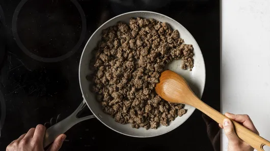 Brown the beef in a 10-inch skillet over medium-high heat until it’s no longer pink, breaking it up with a large spoon. This will take 7 to 9 minutes. Place it in a colander over a bowl to drain the fat from the meat.