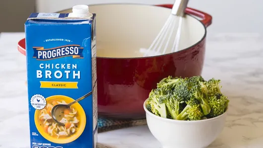 Step2Gradually beat in 1 carton (32 oz) Progresso™ chicken broth. Add 4 cups chopped broccoli florets. Heat mixture to simmering; cook about 10 minutes or until broccoli is tender.