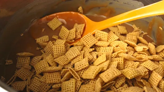 Step5In 2-quart saucepan, melt caramels with evaporated milk over medium heat, stirring until smooth. Remove from heat. Stir in cereal.