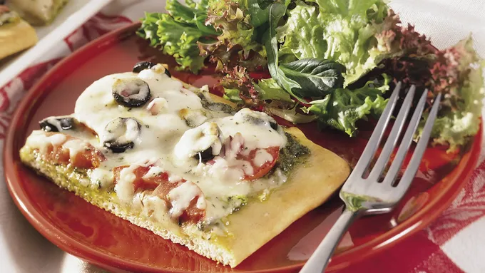 Ready-made basil pesto lends classic Italian garlic-and-herb flavor to this pizza that steps outside the box!