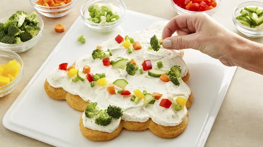 Step4Place each tree on serving platter. In small bowl, mix cream cheese, sour cream, dill and garlic powder; blend until smooth. Spread mixture over both trees. Decorate trees with assorted vegetable pieces. Refrigerate until serving time. To serve, pull apart slices of tree.