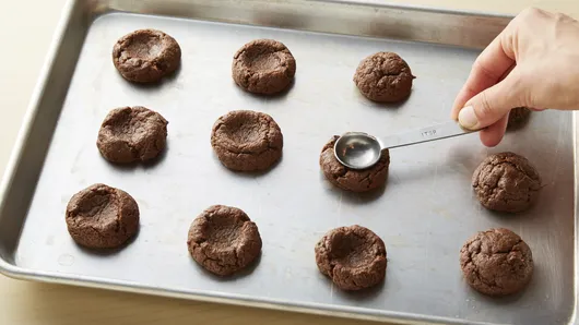 Step3Bake 12 to 15 minutes or until edges are set. Remove from oven. Using back of round metal measuring teaspoon, make 1-inch indentation in center of each cookie. Cool 1 minute on cookie sheets; remove to cooling rack. Cool completely, about 30 minutes.