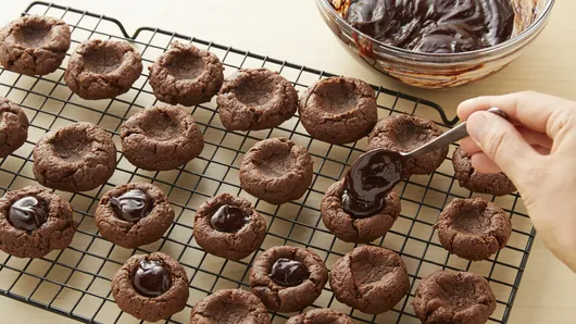 Chocolate lovers, these cookies are for you. This fudgy spin on thumbprints is made extra decadent with the help of a ganache filling — so you know they’re good!