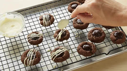 Step5Meanwhile, in small microwavable bowl, microwave white vanilla baking chips and oil uncovered on High 30 to 60 seconds, stirring every 15 seconds, until melted and smooth. Drizzle over chocolate-filled cookies. Refrigerate about 30 minutes or until drizzle is set. Store covered in refrigerator.
