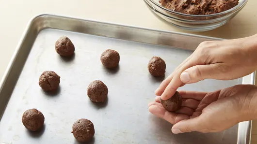 Step2In large bowl, crumble cookie dough; stir or knead in cocoa and cream cheese until well mixed. Shape tablespoonfuls dough into 28 (about 1 1/2-inch) balls. Place 1 inch apart on ungreased cookie sheets.