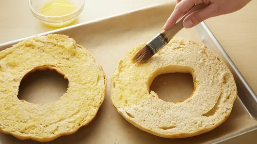 Line 18x13-inch sheet pan with cooking parchment paper. With serrated bread knife, carefully cut bread in half horizontally; place bread rings cut sides up on pan.
