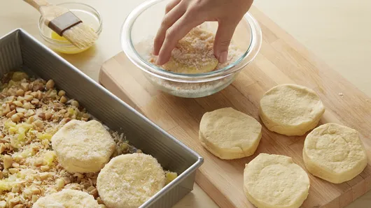 Step4Separate dough into 8 biscuits. Brush both sides of each biscuit with remaining 2 tablespoons melted butter. One biscuit at a time, press each side lightly into granulated sugar mixture. Arrange coated biscuits in single layer on pineapple mixture in pan. Sprinkle any remaining sugar mixture over top.