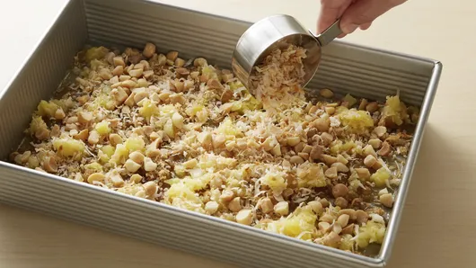 Step2Place 3 tablespoons of the melted butter in pan; spread to cover bottom of pan. Sprinkle brown sugar evenly over butter. Top with pineapple, nuts and 1/2 cup of the coconut.