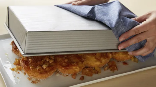 Step6Place heatproof serving platter or foil-lined cookie sheet upside down over pan. Turn platter and pan over; remove pan. Scrape any pineapple mixture from bottom of pan; spread evenly over biscuits. Serve warm.