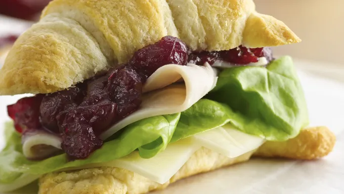 Step3Spread cranberry chutney on top of rectangle, within 1/4 inch of edges. Arrange sliced turkey evenly over cranberry chutney. Sprinkle shredded cheese over sliced turkey.