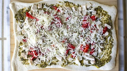 Step2Unroll pizza dough. Spread pesto to edges of dough. Sprinkle with turkey, roasted peppers and cheese. Sprinkle Italian seasoning over top.