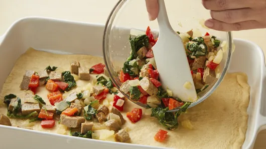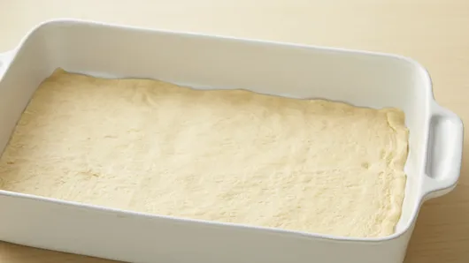 Heat oven to 375°F. Spray 13x9-inch (3-quart) glass baking dish with cooking spray. Unroll dough, and press into bottom of dish; set aside.