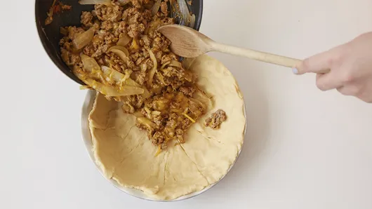 Step2In 10-inch nonstick skillet, cook turkey and onion over medium heat 7 to 9 minutes, stirring occasionally, until thoroughly cooked; drain. Return turkey mixture to skillet. Stir in taco seasoning mix, water and green chiles; cook 1 to 2 minutes, stirring constantly, until slightly thickened. Stir in 1 1/2 cups of the cheese; spoon mixture into crust-lined pie plate; sprinkle with remaining 1/2 cup cheese.