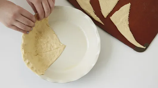 Step1Heat oven to 375°F. Spray 10-inch pie plate with cooking spray. Unroll dough, separate into 8 triangles; press over bottom and up side of pie plate to form crust.