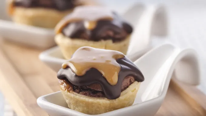 Step3Place 2 brownies in each taco shell, then top with whipped topping, pecans and caramel sauce.