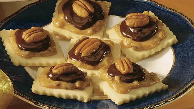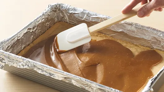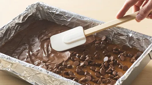 Step4Refrigerate bars until chocolate is firm, about 1 hour. Remove from pan using foil as handles. Cut into 4 rows by 3 rows; cut each bar in half diagonally for a total of 24 triangle-shaped bars.