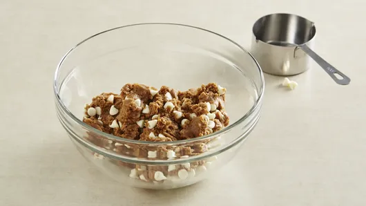 Step2In large bowl, break up cookie dough. Add molasses and egg; stir until blended. (DO NOT EAT RAW COOKIE DOUGH AFTER COMBINING WITH EGG.) Add flour, ginger, cinnamon, cloves and 1/2 cup of the baking chips; mix with spoon or hands until well blended.