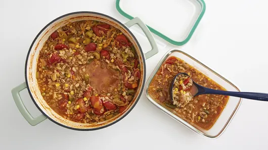 Spoon 5 1/3 cups of the soup into each of four 6-cup freezer/microwave containers. Cool 30 to 45 minutes. Cover; refrigerate up to 3 days or freeze up to 2 months.
