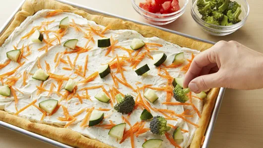 var configuration = {"title":"Veggie Pizza","introduction":"\u003cp\u003eLight yet indulgent, this luscious veggie pizza makes a tasty appetizer, snack, or light meal—it’s one of our best vegetable pizzas for any occasion! A generous layer of seasoned sour cream and cream cheese topped with fresh veggies creates a satisfying crunch in every bite. Pillsbury™ Crescent Rolls are used for the light, flaky crust. This simple crescent veggie pizza is a great way for the whole family to get those veggies in!\u003c/p\u003e\n\n\u003cp\u003eThis cold veggie pizza is all ready to party when cut into small, bite-size portions—and you don’t have to worry about keeping it warm! It’s a crowd-favorite recipe that’s always a hit at potlucks, game day gatherings, and more. We’d also eat veggie pizza as a light meal or snack any day of the week. Wherever you serve it up, everyone will be coming back for seconds!\u003c/p\u003e","servingSize":"1 Appetizer","image":{"small":{"media":"(min-width: 0px)","src":"https://mojo.generalmills.com/api/public/content/AXO1iNHobkSfP2XiiYEs7A_webp_base.webp?v=dcf2bbb6\u0026t=e724eca7b3c24a8aaa6e089ed9e611fd"},"medium":{"media":"(min-width: 500px)","src":"https://mojo.generalmills.com/api/public/content/AXO1iNHobkSfP2XiiYEs7A_webp_base.webp?v=dcf2bbb6\u0026t=191ddcab8d1c415fa10fa00a14351227"},"large":{"media":"(min-width: 767px)","src":"https://mojo.generalmills.com/api/public/content/AXO1iNHobkSfP2XiiYEs7A_webp_base.webp?v=dcf2bbb6\u0026t=191ddcab8d1c415fa10fa00a14351227"},"alt":"Veggie Pizza"},"contributor":{"label":"By","name":"Pillsbury Kitchens","profileUrl":"/about-us","displayDate":{"label":"Updated","date":"Jul 26, 2024"}},"ingredientGroups":[{"ingredients":[{"quantity":"2","description":"cans (8 oz) refrigerated Pillsbury™ Original Crescent Rolls (8 Count) or 2 cans (8 oz) refrigerated Pillsbury™ Original Crescent Dough Sheet","productLink":"/products/crescents/original"},{"quantity":"1","description":"package (8 oz) cream cheese, softened"},{"quantity":"1/2","description":"cup sour cream"},{"quantity":"1","description":"teaspoon dried dill weed"},{"quantity":"1/8","description":"teaspoon garlic powder"},{"quantity":"1/2","description":"cup small fresh broccoli florets"},{"quantity":"1/3","description":"cup quartered cucumber slices"},{"quantity":"1","description":"plum (Roma) tomato, seeded, chopped"},{"quantity":"1/4","description":"cup shredded carrot"}]}],"steps":[{"description":"Heat oven to 375°F."},{"description":"If using crescent rolls: Unroll both cans of dough; separate dough into 4 long rectangles. In ungreased 15x10x1-inch pan, place dough; press in bottom and up sides to form crust. If using dough sheets: Unroll both cans of dough. In ungreased 15x10x1-inch pan, place dough; press in bottom and up sides to form crust.","stepShotImageUrl":"//mojo.generalmills.com/api/public/content/bzsbu0vjXUaSKalobeP_gQ_webp_base.webp?v=88907b45\u0026t=51a43a57af4046789e5a7f20567b1195"},{"description":"Bake 13 to 17 minutes or until golden brown. Cool completely, about 30 minutes."},{"description":"In small bowl, mix cream cheese, sour cream, dill and garlic powder until smooth. Spread over crust. Top with vegetables. Serve immediately, or cover and refrigerate 1 to 2 hours before serving. Cut into 8 rows by 4 rows.","stepShotImageUrl":"//mojo.generalmills.com/api/public/content/Q4E40S57a02HY9bP8b6pjg_webp_base.webp?v=66b25003\u0026t=51a43a57af4046789e5a7f20567b1195"}],"tips":[{"title":"","description":"This easy, top-rated veggie pizza is made with a Pillsbury crescent roll crust, covered in seasoned cream cheese and topped with fresh veggies. Yum!","category":"Rich Snippet"},{"title":"","description":"Layers of fat in the crescent dough help them rise, creating a pizza crust that is lighter that a traditional bread dough crust.","category":"Recipe/Ingredient Facts"},{"title":"","description":"Serve at room temperature or chilled as an appetizer or summer patio supper, topped with a casual mix of veggies or creatively arranged in rows.","category":"Serving Suggestions/Menu"},{"title":"","description":"To easily soften cream cheese, remove wrapper and place on a microwaveable plate. Microwave uncovered on High for 15 to 20 seconds or until softened.","category":"Techniques"},{"title":"","description":" We love this decadent way to enjoy pizza in an entirely new way-as a cold appetizer! If you crave that cheesiness more often in your meals, these inventive pizzas should be next on your list! From \u003ca href=\u0022https://www.pillsbury.com/recipes/stuffed-crust-pizza-snacks/42c145a4-474c-4e0e-9437-d7d1da0ea204\u0022\u003eStuffed Pizza Snacks\u003c/a\u003e to \u003ca href=\u0022https://www.pillsbury.com/recipes/breakfast-pizza/cc5ad6f7-aa8f-492e-a9d5-dcaf6f08a05e\u0022\u003eBreakfast Pizza\u003c/a\u003e or \u003ca href=\u0022https://www.pillsbury.com/recipes/pepperoni-pizza-cake/a39070fb-2d1a-462c-a557-5876909c247c\u0022\u003ePepperoni Pizza Cake\u003c/a\u003e, we’ve got pizza recipes for every taste and meal occasion.","category":"Editorial"},{"title":"","description":"Recipe meets Kitchen Tested criteria. Reviewed as part of project MSO-5941 BC Audit 200 recipes","category":"Kitchen Tested"}],"kitchenTips":[{"title":"","description":"Layers of fat in the crescent dough help them rise, creating a pizza crust that is lighter that a traditional bread dough crust.","category":"Recipe/Ingredient Facts"},{"title":"","description":"Serve at room temperature or chilled as an appetizer or summer patio supper, topped with a casual mix of veggies or creatively arranged in rows.","category":"Serving Suggestions/Menu"},{"title":"","description":"To easily soften cream cheese, remove wrapper and place on a microwaveable plate. Microwave uncovered on High for 15 to 20 seconds or until softened.","category":"Techniques"}],"additionalContent":[{"title":"How to Make Veggie Pizza","description":"\u003cp\u003eOur crescent veggie pizza is so easy to make! Before we