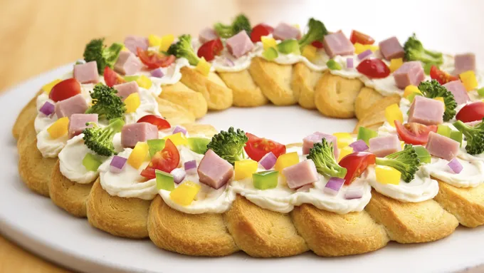 Easily transform crescent rolls into a festive first course for 16. Wrap red and green veggies inside and decorate with fresh rosemary "greenery." It's a beautiful edible centerpiece!