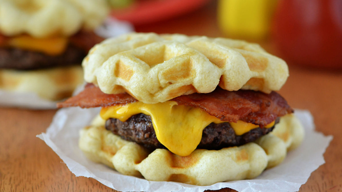 Step4To serve, place each patty on 1 baked biscuit waffle. Top each patty with 1 slice of cheese and 1 halved bacon slice. Cover with remaining baked biscuit waffles.