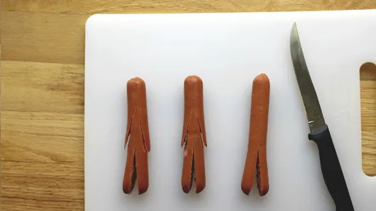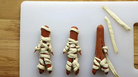 Step3Take one hot dog at a time and make a slit at the bottom for the mummy’s legs. Then, make two slits along the sides for the mummy’s arms.