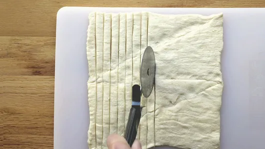 Step2With a pizza cutter, cut each rectangle lengthwise into 10 strips, making a total of 40 strips of dough.
