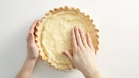 Step4When crust is cool, stir white vanilla baking chips into pudding. Spread pudding into cooled crust. Place piece of plastic wrap over top of pie, touching surface of pudding. Refrigerate at least 4 hours until pudding is completely set.