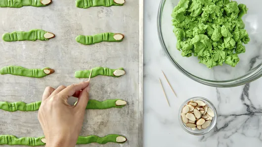 var configuration = {"title":"Witches Fingers Cookies","introduction":"Spooky and tasty aren’t words you often find together, but they describe these Halloween witch finger cookies perfectly. Fun for the whole family, these treats are easy to make—especially if you have extra hands in the kitchen. The best part? Our spooky Witches Fingers Cookies recipe makes plenty of treats (no tricks to be found!), so you\u0027ll have the perfect party platter or Halloween handout to share.","servingSize":"1 Cookie","image":{"small":{"media":"(min-width: 0px)","src":"https://mojo.generalmills.com/api/public/content/1S8E23WqAEGjVPcs9HES4g_webp_base.webp?v=522ec3dc\u0026t=e724eca7b3c24a8aaa6e089ed9e611fd"},"medium":{"media":"(min-width: 500px)","src":"https://mojo.generalmills.com/api/public/content/1S8E23WqAEGjVPcs9HES4g_webp_base.webp?v=522ec3dc\u0026t=191ddcab8d1c415fa10fa00a14351227"},"large":{"media":"(min-width: 767px)","src":"https://mojo.generalmills.com/api/public/content/1S8E23WqAEGjVPcs9HES4g_webp_base.webp?v=522ec3dc\u0026t=191ddcab8d1c415fa10fa00a14351227"},"alt":"Witches Fingers Cookies"},"contributor":{"label":"By","name":"Pillsbury Kitchens","profileUrl":"/about-us","displayDate":{"label":"Updated","date":"Sep 23, 2022"}},"ingredientGroups":[{"ingredients":[{"quantity":"1","description":"roll (16.5 oz) refrigerated Pillsbury™ Sugar Cookie Dough","productLink":"/products/cookies/refrigerated-cookies/sugar-cookies"},{"quantity":"1/2","description":"cup all-purpose flour"},{"quantity":"1/2","description":"teaspoon green gel food color"},{"quantity":"1/4","description":"cup sliced blanched almonds"}]}],"steps":[{"description":"Heat oven to 350°F."},{"description":"Crumble dough into medium bowl. Stir or knead dough with flour and green food color until well mixed. (DO NOT EAT RAW COOKIE DOUGH AFTER COMBINING WITH FLOUR.)","stepShotImageUrl":"//mojo.generalmills.com/api/public/content/2wEi_fM_rEGH9BB_irr61A_webp_base.webp?v=038109ed\u0026t=51a43a57af4046789e5a7f20567b1195"},{"description":"Shape into 65 (3/4-inch) balls. Shape each ball into a 4-inch finger. Press sliced almond onto end of each finger. Using toothpick, make 3 indentations just below the almond “fingernail” and another 3 indentations in the middle of each finger to form the knuckles.","stepShotImageUrl":"//mojo.generalmills.com/api/public/content/QRzGz8J-_USIiZNmKVFpcQ_webp_base.webp?v=9eb4afde\u0026t=51a43a57af4046789e5a7f20567b1195"},{"description":"Place 1 1/2 inches apart on ungreased cookie sheet; bake 7 to 8 minutes or until lightly browned just around edges. Cool 2 minutes; remove from cookie sheets to cooling racks. Cool completely, about 30 minutes. Store in covered container at room temperature."}],"tips":[{"title":"","description":"Make sure to thoroughly knead the green gel food color into the dough to get an even color without streaks.","category":"Method Note","tipShots":[]},{"title":"","description":"Make this spooky Witches Fingers Cookies recipe your own—use decorating gels and cookie icings to decorate as desired.","category":"Presentation/Garnish","tipShots":[]},{"title":"","description":"For best results, bake your Witches Fingers Cookies on the middle oven rack. For even baking, it’s best to bake one sheet at a time.","category":"Method Note","tipShots":[]},{"title":"","description":"When baking batches of witch finger sugar cookies, use completely cooled cookie sheets. Cookies will spread too much if put on a hot or warm cookie sheet.","category":"Method Note","tipShots":[]},{"title":"","description":"Kitchen Tested - 8/2022.","category":"Kitchen Tested","tipShots":[]}],"kitchenTips":[{"title":"","description":"Make sure to thoroughly knead the green gel food color into the dough to get an even color without streaks.","category":"Method Note","tipShots":[]},{"title":"","description":"Make this spooky Witches Fingers Cookies recipe your own—use decorating gels and cookie icings to decorate as desired.","category":"Presentation/Garnish","tipShots":[]},{"title":"","description":"For best results, bake your Witches Fingers Cookies on the middle oven rack. For even baking, it’s best to bake one sheet at a time.","category":"Method Note","tipShots":[]},{"title":"","description":"When baking batches of witch finger sugar cookies, use completely cooled cookie sheets. Cookies will spread too much if put on a hot or warm cookie sheet.","category":"Method Note","tipShots":[]}],"additionalContent":[],"faq":[],"tipCategories":[{"categoryName":"Kitchen Tested","heading":"More About This Recipe","cssClass":"recipePartStory","expandOnInit":false,"expandText":"More +","collapseText":"Less -","expandEventName":"","collapseEventName":"","image":"","tips":[{"title":"","description":"Kitchen Tested - 8/2022.","category":"Kitchen Tested","tipShots":[]}],"isExpandable":false},{"categoryName":"Method Note","heading":"","cssClass":"recipePartMethodNote","expandOnInit":false,"expandText":"More +","collapseText":"Less -","expandEventName":"","collapseEventName":"","image":"","tips":[{"title":"","description":"Make sure to thoroughly knead the green gel food color into the dough to get an even color without streaks.","category":"Method Note","tipShots":[]},{"title":"","description":"For best results, bake your Witches Fingers Cookies on the middle oven rack. For even baking, it’s best to bake one sheet at a time.","category":"Method Note","tipShots":[]},{"title":"","description":"When baking batches of witch finger sugar cookies, use completely cooled cookie sheets. Cookies will spread too much if put on a hot or warm cookie sheet.","category":"Method Note","tipShots":[]}],"isExpandable":false}],"nutritionInfo":{"configuration":{"showAsTable":false,"noNutritionInformationAvailableMessage":"No nutrition information available for this recipe","poweredByText":"\u003cp\u003eNutrition information for this recipe is estimated using a leading nutrition calculation application, but is an estimate only. Actual nutrition 