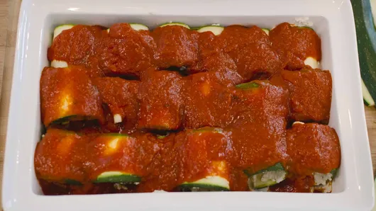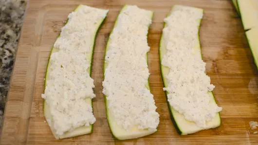Step4Cut 3 to 4 large zucchini into 1/8-inch slices. Layer 5 zucchini slices on microwavable plate; microwave uncovered on High 30 seconds. Immediately spread 1 1/2 tablespoons ricotta filling onto each of the 5 zucchini slices. Roll up each slice; place seam side down in baking dish. Repeat with remaining zucchini slices and filling.